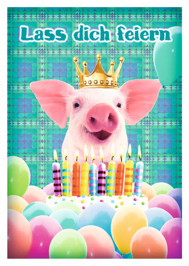 Ein glückliches Schwein mit einer goldenen Krone sitzt vor einer bunten Geburtstagstorte mit Kerzen und Luftballons. Der festliche Hintergrund vermittelt eine fröhliche Stimmung.