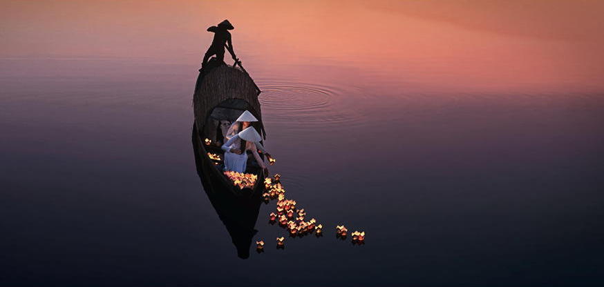 Auf einem ruhigen Gewässer paddelt eine Frau in einem kleinen Boot, während sie kunstvolle Lichter ins Wasser setzt. Der Sonnenuntergang schafft eine magische Atmosphäre.