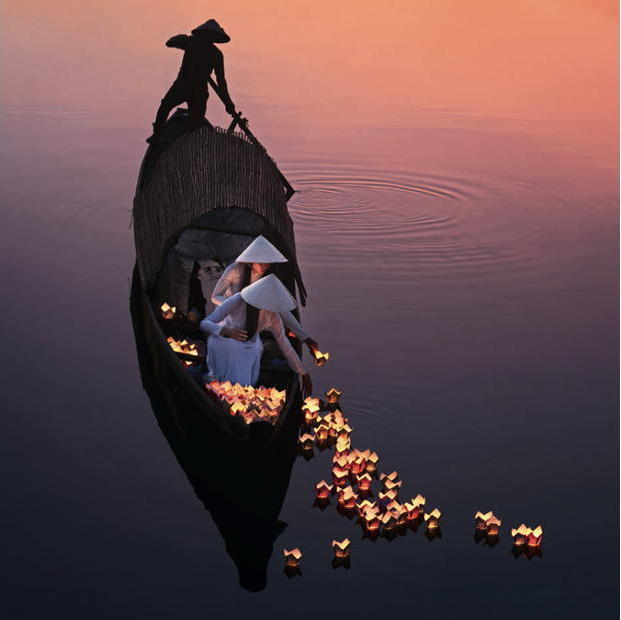 Auf dem ruhigen Wasser eines Sees fahren Menschen in einem Boot. Sie tragen traditionelle Hüte und lassen leuchtende Laternen in das Wasser gleiten, während die Sonne untergeht.
