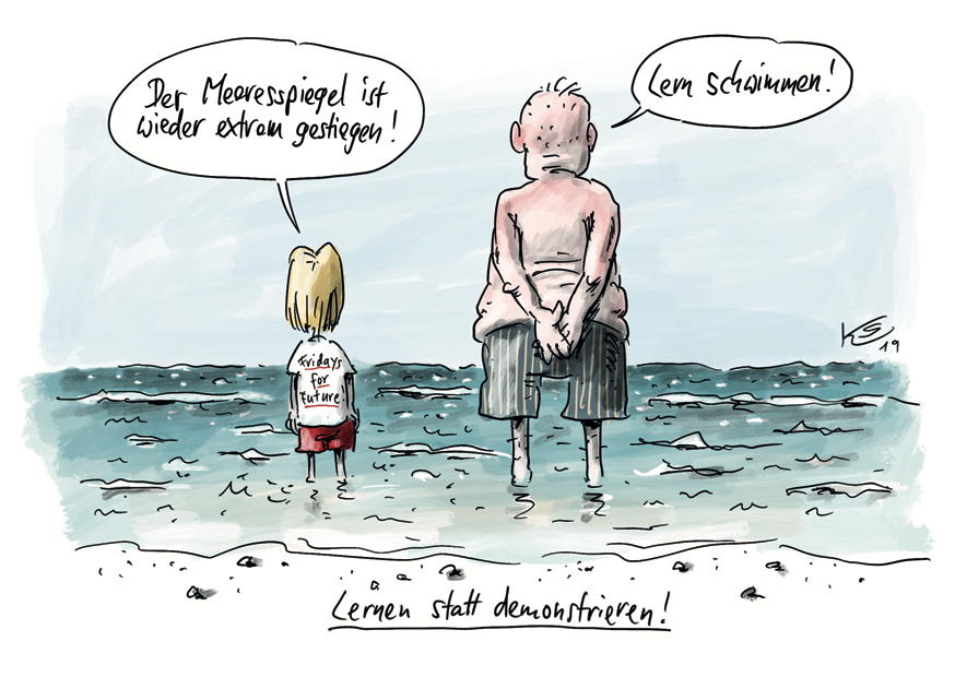 Ein Kind und ein Erwachsener stehen am Strand und sprechen über den Anstieg des Meeresspiegels.