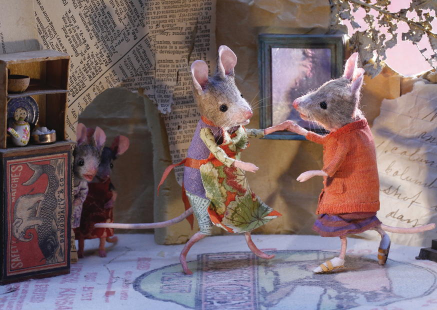 In einem liebevoll gestalteten Raum tanzen zwei Mäuse in bunten Kleidern, während eine dritte Maus neugierig im Hintergrund beobachtet und die Atmosphäre genießt.