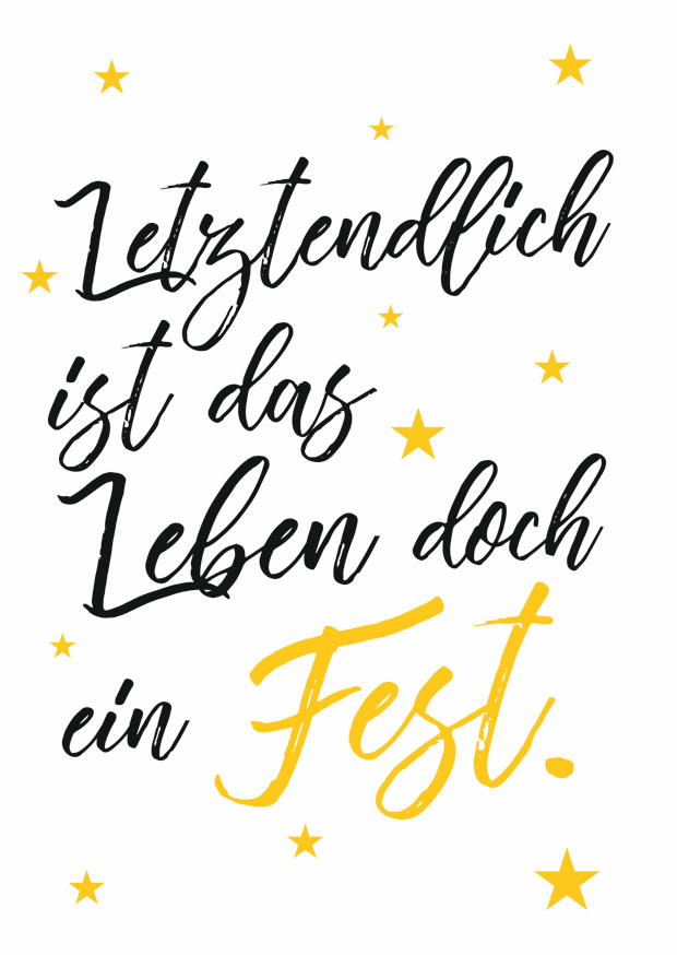Ein inspirierendes Zitat betont die Feier des Lebens, umgeben von leuchtenden Sternen auf einem weißen Hintergrund. Ideal für eine positive Atmosphäre.