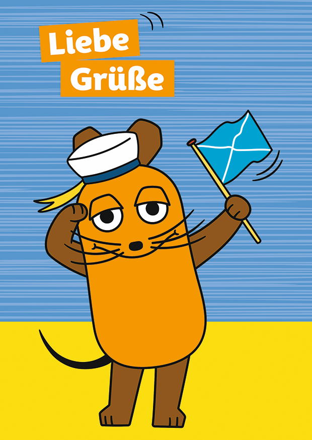 Eine cartoonartige Maus trägt eine Matrosenmütze und winkt mit einer blauen Flagge. Sie steht fröhlich am Strand und genießt das sonnige Wetter.