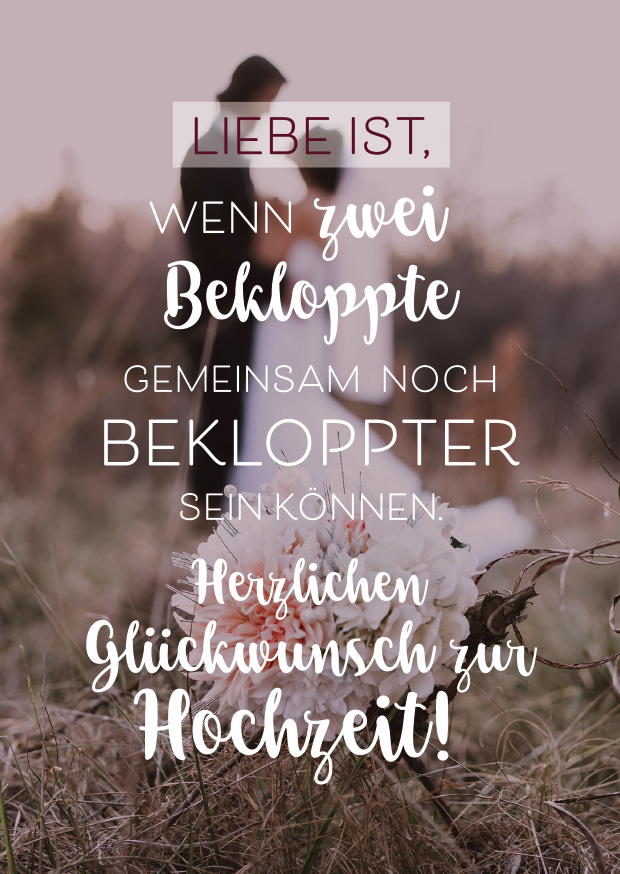 Eine herzliche Botschaft zur Hochzeit, die die Freude und den Spaß zweier Liebender betont, umgeben von floralen Details auf einer Wiese.