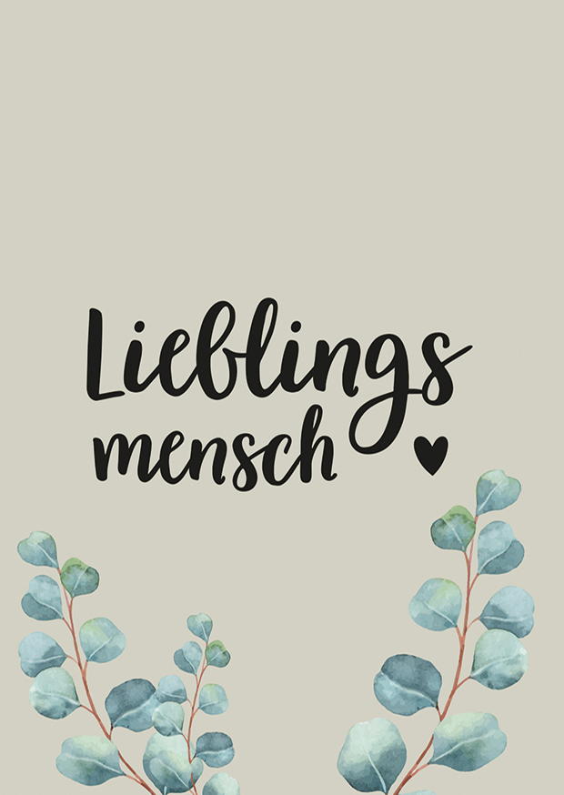 Diese ansprechende Gestaltung präsentiert den Schriftzug Lieblingsmensch umgeben von sanften Eukalyptusblättern und eignet sich hervorragend für eine gemütliche Atmosphäre.