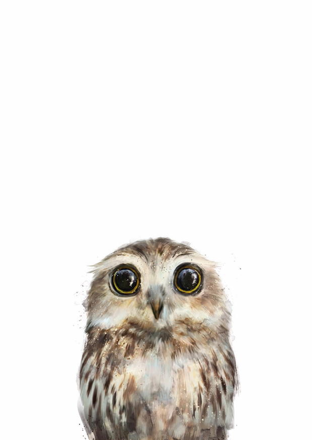 Eine kleine Eule sitzt aufmerksam und blickt mit großen, runden Augen in die Kamera. Der weiße Hintergrund hebt die Details ihres Gefieders hervor.