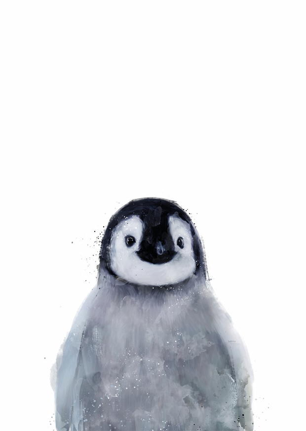 Der Pinguin schaut freundlich in die Kamera und scheint neugierig zu sein. Sein gefiederter Körper hebt sich deutlich vor dem hellen Hintergrund ab.
