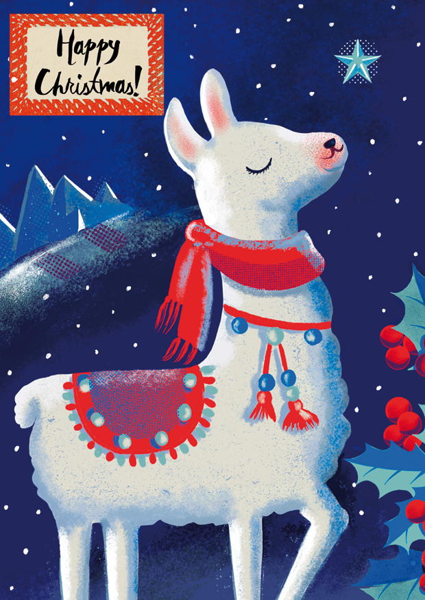 Ein süßes Lama trägt einen roten Schal und hat eine festliche Verzierung um den Hals, während es friedlich in einer schneebedeckten Landschaft steht.