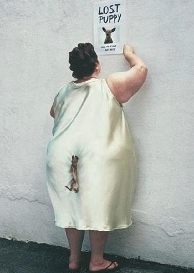 Eine Person mit einem lustigen Kleid sucht nach einem verlorenen Welpen, während sie ein Schild an eine Wand hängt. Die Situation ist humorvoll und auffällig.