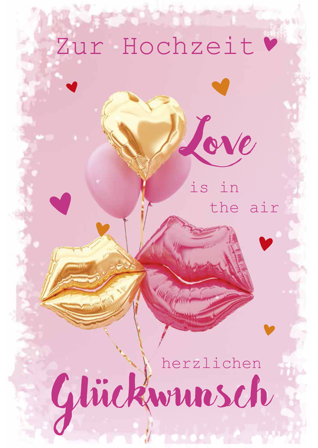 Bunte Luftballons in Herz- und Lippenform zieren eine Hochzeitskarte, die auf die Liebe anspielt und herzlich zum feierlichen Anlass gratuliert.