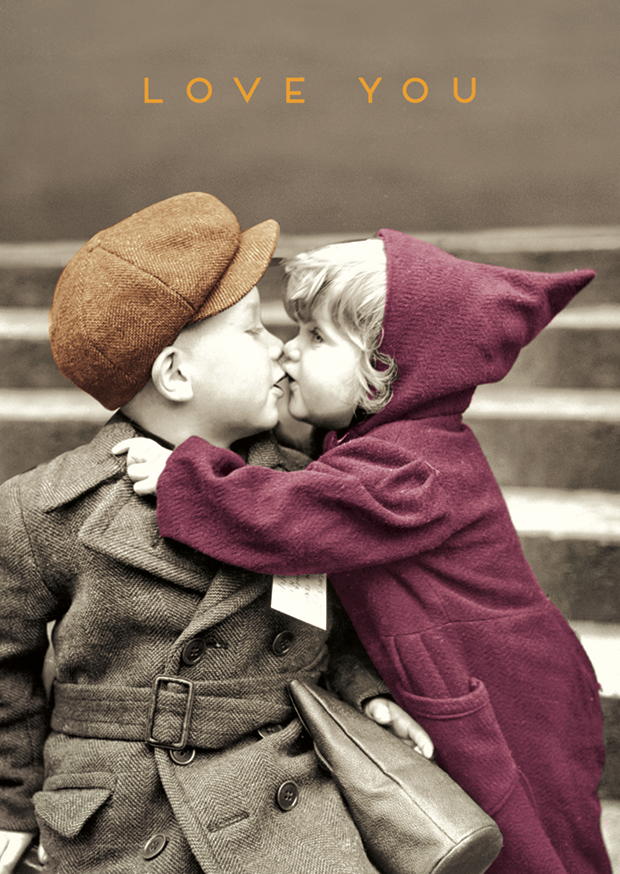 Zwei kleine Kinder in nostalgischen Outfits stehen sich gegenüber und bringen Zuneigung zum Ausdruck, während sie sich an eine Treppe schmiegen und glücklich wirken.