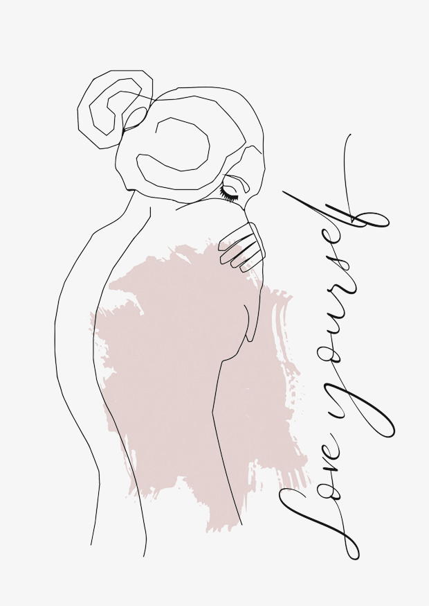 Die Grafik zeigt eine elegante und minimalistische Darstellung einer Person, die sich selbst umarmt, um Selbstliebe und innere Ruhe auszudrücken.