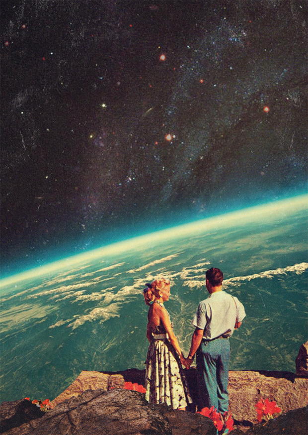 Das Paar, gekleidet in Vintage-Kleidung, genießt den Ausblick auf den nächtlichen Himmel mit vielen Sternen, während sie Hand in Hand stehen.