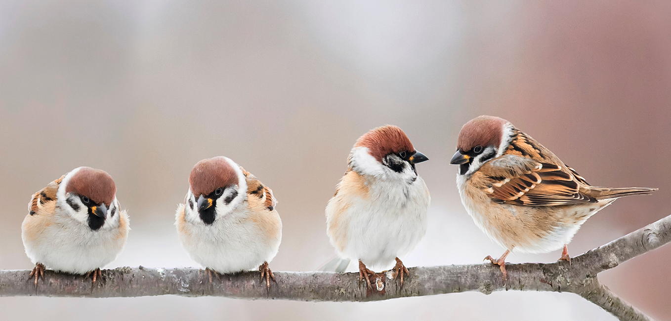 Vier Spatzen sitzen auf einem Ast. Sie scheinen sich lebhaft zu unterhalten, während die winterliche Umgebung eine ruhige Atmosphäre schafft.