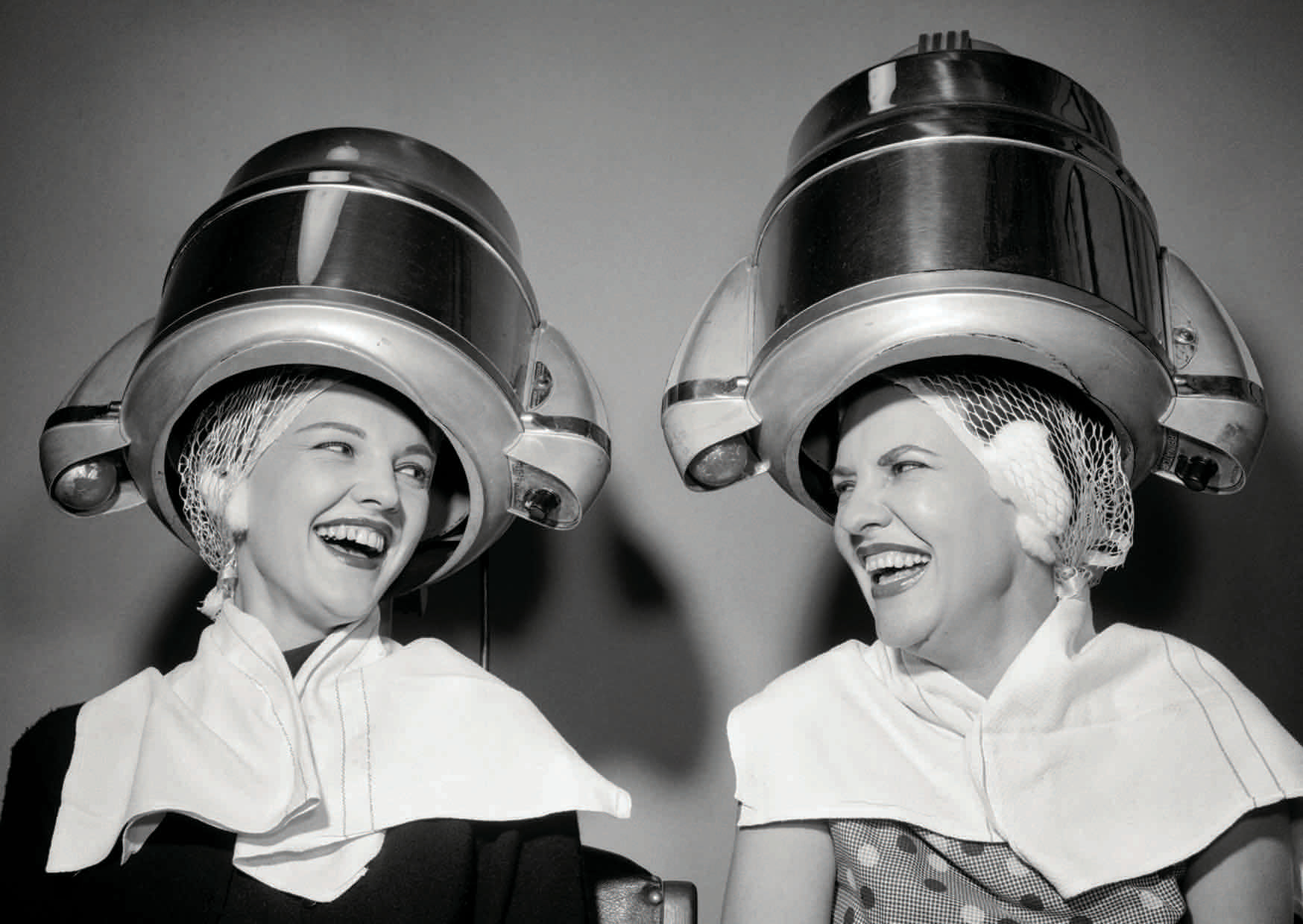 Zwei Frauen genießen ein Lächeln beim Friseur, während sie unter traditionellen Haartrocknern sitzen. Die Umgebung spiegelt den Stil der 1950er Jahre wider.