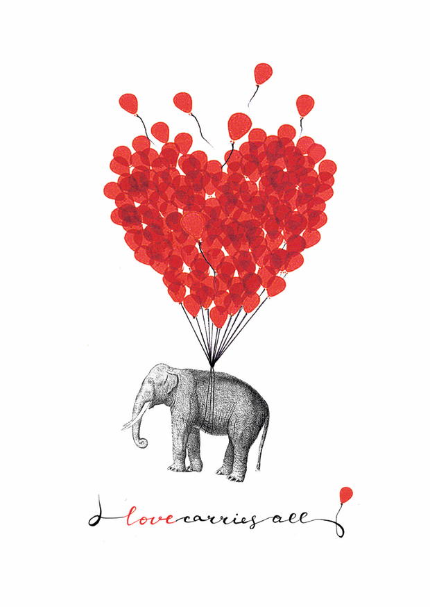Ein Elefant hebt mit vielen roten Ballons in die Höhe. Die Ballons formen ein großes Herz, welches die Kraft der Liebe darstellt. Diese kreative Illustration zeigt Freude und Leichtigkeit.