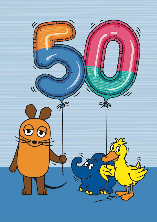 Die Charaktere einer bekannten Kinderserie Sendung mit der Maus halten Luftballons in Form der Zahl 50. Die fröhliche Atmosphäre entsteht durch die bunten Farben und die tierischen Freunde.