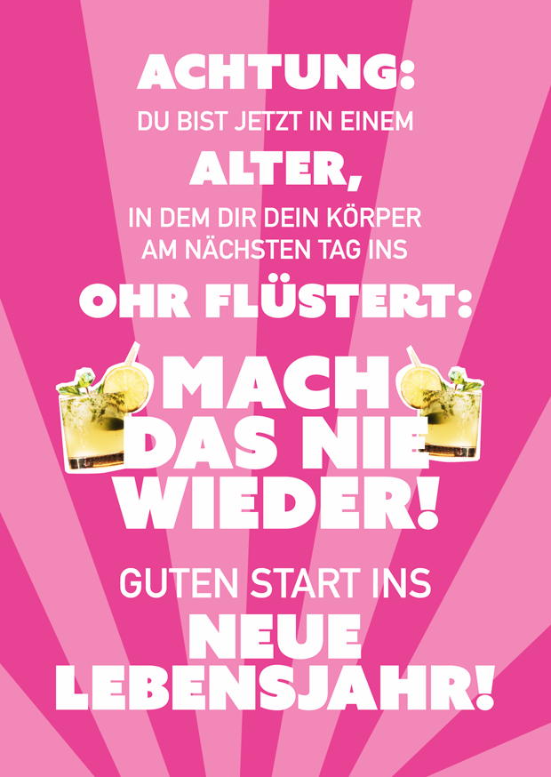 Ein humorvoller Geburtstagsgruß, der den Beginn eines neuen Lebensjahres feiert und eine witzige Warnung über eigene Grenzen gibt. Es wird auf den nächste Tag angespielt.