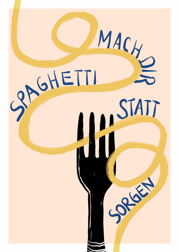 Ein kreatives Motiv zeigt eine Gabel, die mit einer Spaghettischnur verbunden ist. Die Worte animieren dazu, die Freude am Essen und der Vergangenheit mehr Bedeutung zu geben.
