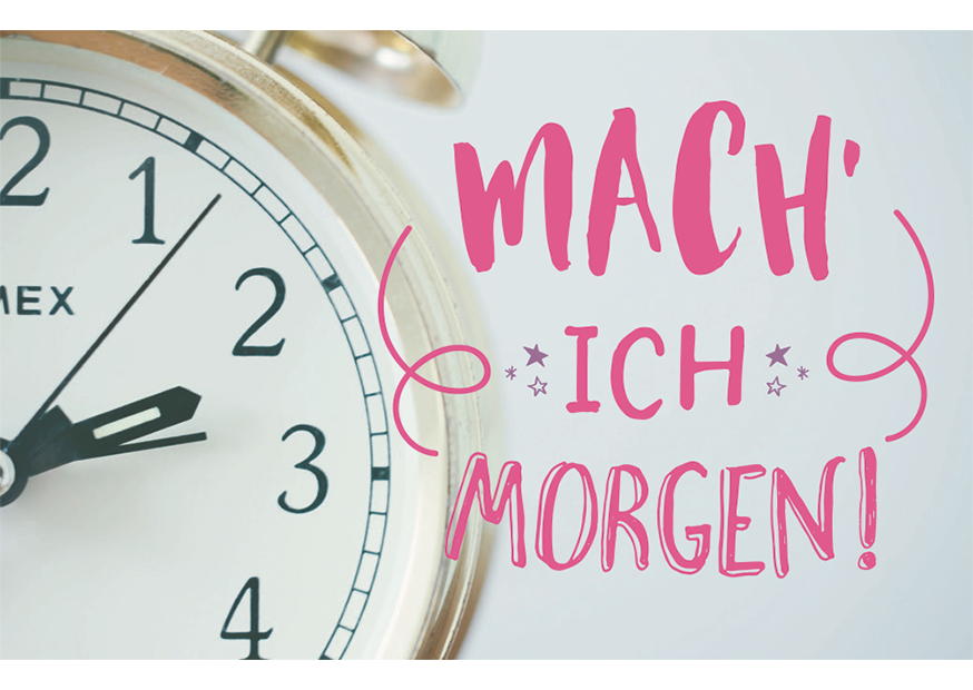 Eine nahe Ansicht einer klassischen Uhr, die fast drei Uhr anzeigt, versehen mit einem auffälligen Text, der Motivation und Aufschub vermittelt.