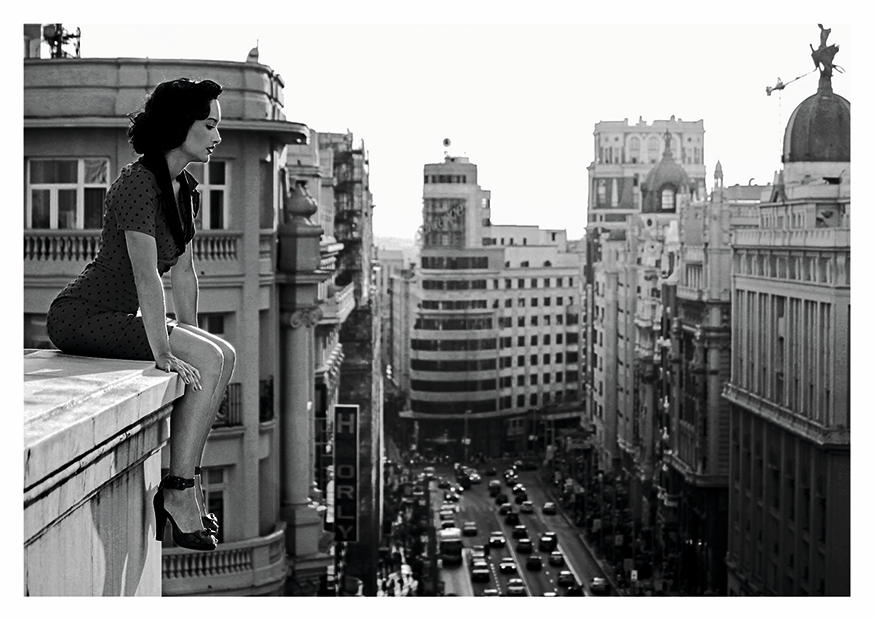 Auf einem hohen Gebäude in Madrid sitzt eine Frau elegant gekleidet auf der Kante und betrachtet die belebte Stadt, während Autos vorbeifahren.