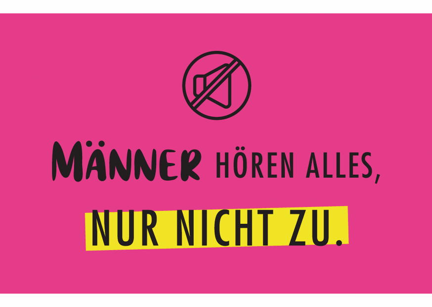 Der Spruch auf dem bunten Plakat beschreibt humorvoll die oft wahrgenommene Unfähigkeit von Männern, aktiv zuzuhören, während sie alles andere hören.