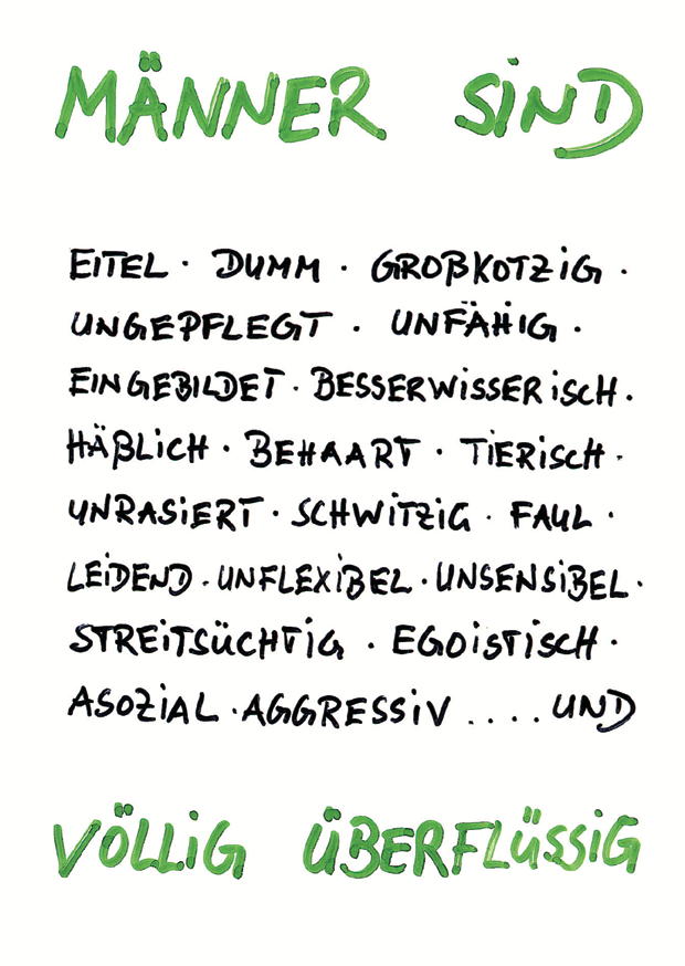 Die Notizen formulieren eine kritische Sicht auf Männer, indem sie negative Eigenschaften und Klischees in einer direkten und provokativen Weise auflisten.