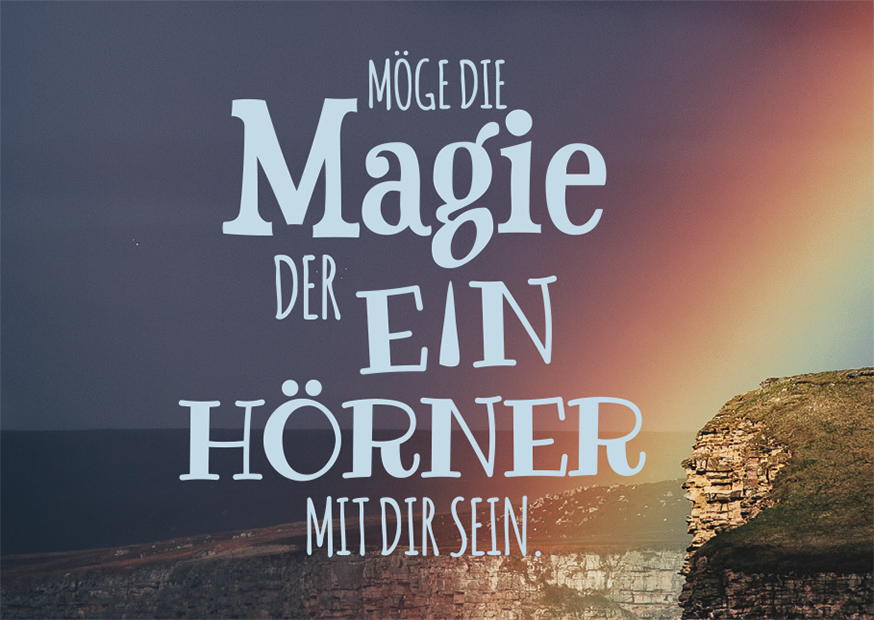 Eine wunderschöne Küstenlandschaft wird von einem Regenbogen gekrönt, während eine charmante Botschaft über Magie und Einhörner in Schrift dargestellt ist. Die Szene vermittelt positive Gefühle.