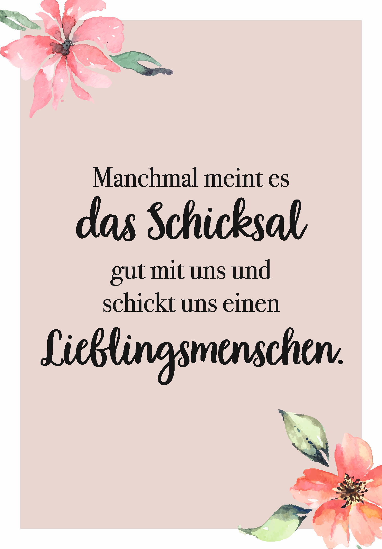 Das Zitat reflektiert über das Schicksal, das uns Lieblingsmenschen bringt. Umgeben von sanften floralen Elementen vermittelt es einen positiven Gedanken.
