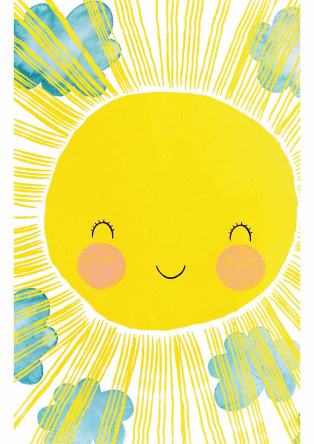 Eine gelbe Sonne lächelt fröhlich zwischen sanften blauen Wolken, ideal für die Gestaltung von Kinderzimmern und die Schaffung einer positiven Atmosphäre.