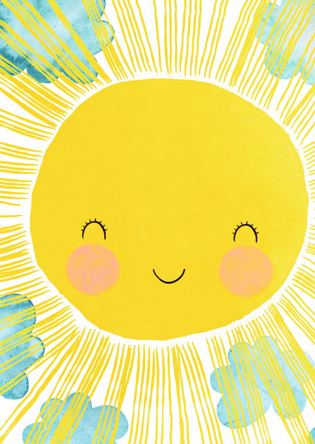 Die Sonne scheint strahlend und freundlich, umgeben von sanften blauen Wolken, die eine angenehme und fröhliche Stimmung vermitteln.