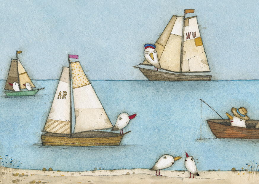 Auf dem Wasser fahren mehrere kleine Boote mit Vögeln, während andere Vögel am Ufer stehen. Der Himmel ist klar und die Stimmung ist friedlich.