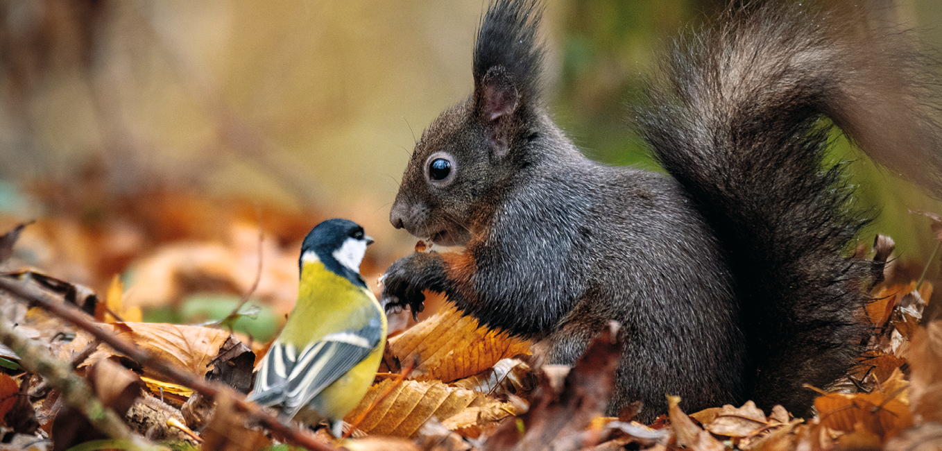 Auf dem bunten Laub spielen ein Eichhörnchen und eine Meise im Herbst. Die Tiere sind aktiv und erkunden ihre Umgebung im dichten Wald.