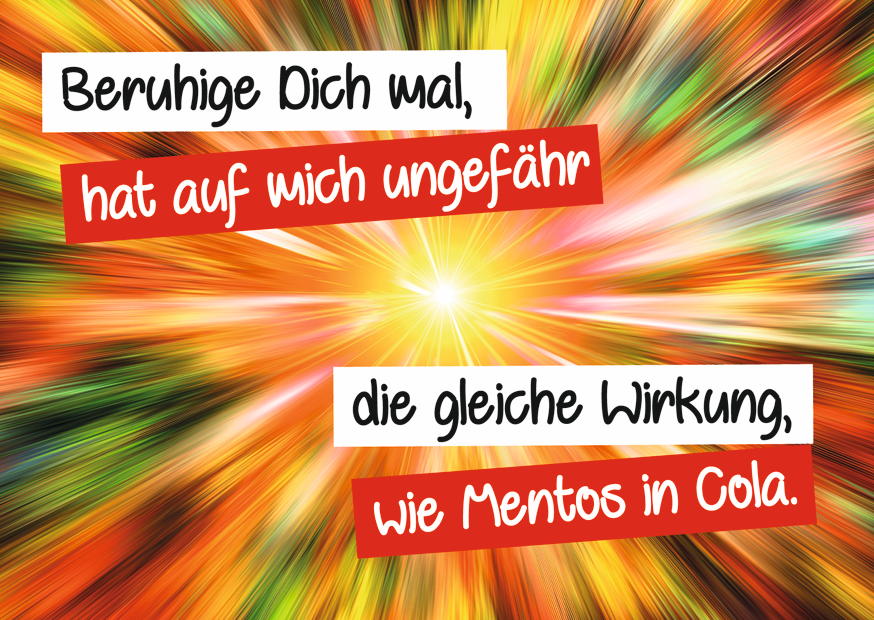 In diesem kreativen Kunstwerk strahlen leuchtende Farben und stilisierte Worte Freude und Energie aus, während sie eine humorvolle Verbindung zu Mentos und Cola herstellen.