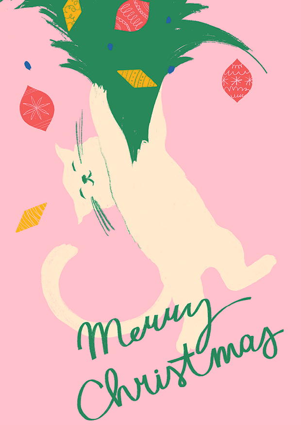 Eine verspielte Katze zieht mit ihren Pfoten an einem Weihnachtsbaum, während farbige Dekorationen um sie herumfliegen. Die Festtagsatmosphäre ist spürbar.