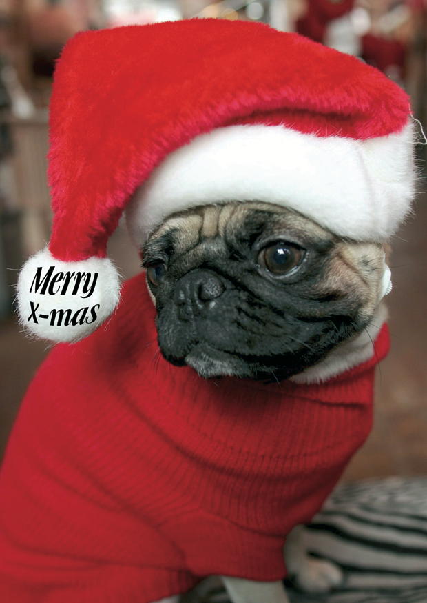 Der Mops trägt einen samtigen roten Pullover und einen Weihnachtsmann-Hut. Dies schafft eine fröhliche Atmosphäre während der festlichen Feiertage.