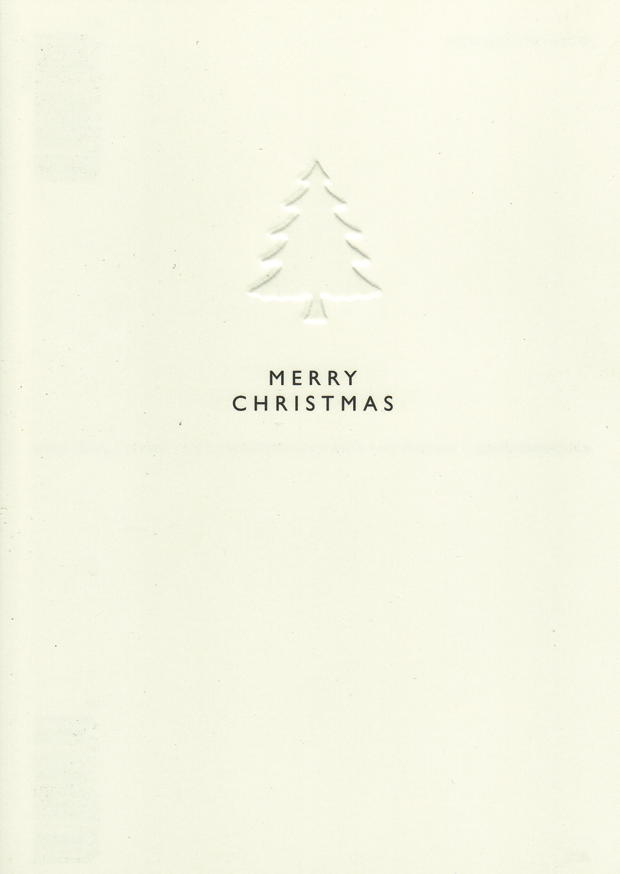 Eine elegante und minimalistische Weihnachtskarte präsentiert einen zarten, geprägten Weihnachtsbaum und den Schriftzug Frohe Weihnachten in klarer Schrift. Ideal für festliche Grüße.