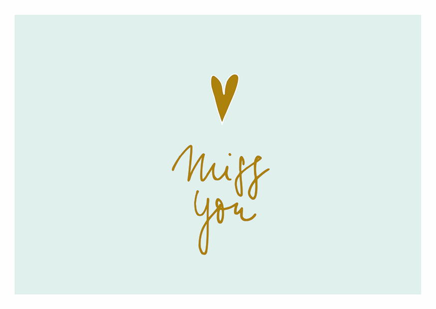 Eine Grußkarte mit der Aufschrift „Miss You“ in goldener Schrift. Der Hintergrund ist sanft hellblau, ideal für emotionale Botschaften und besondere Anlässe.