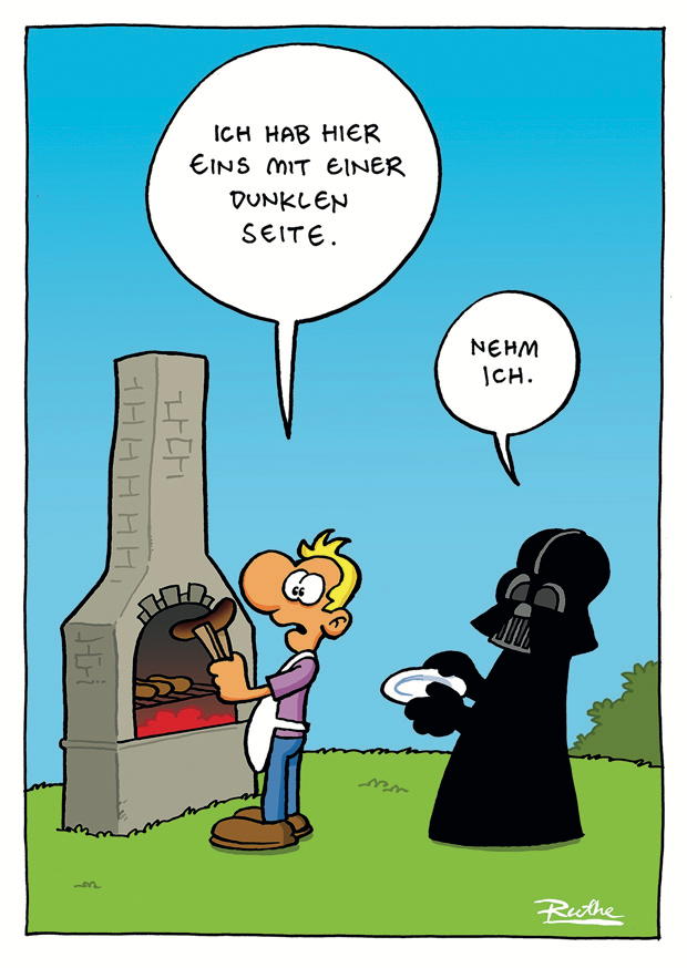 Ein Mann am Grill unterhält sich mit einer dunklen, maskierten Figur, die anscheinend ein Interesse an dem Grillgut zeigt. Es ist eine humorvolle Begegnung.