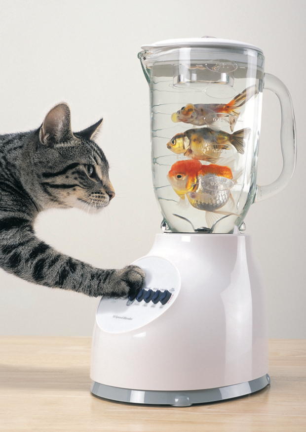 In einer modernen Küche versucht eine Katze, den Mixer zu bedienen, während darin mehrere Goldfische schwimmen und im Wasser umher schwimmen.