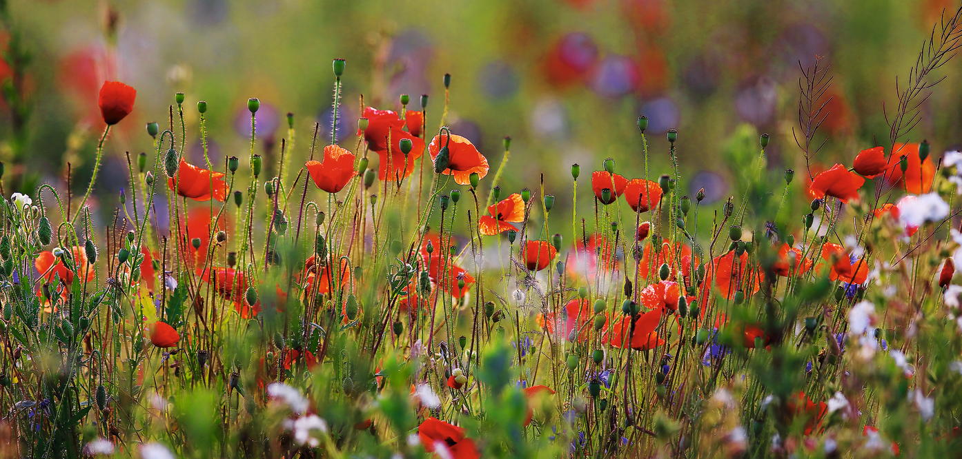 In einer blühenden Wiese im Frühsommer erstrahlen Mohnblumen in leuchtendem Rot neben anderen Wildblumen. Die Farben spielen harmonisch im Sonnenlicht.