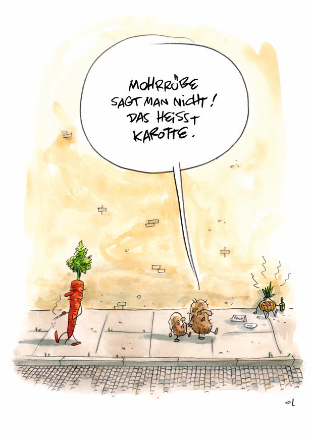 Zwei Figuren sitzen auf dem Gehweg und diskutieren freudig über die Bezeichnung von Karotten. Die Szene ist lustig und zeigt eine große Karotte als Charakter.