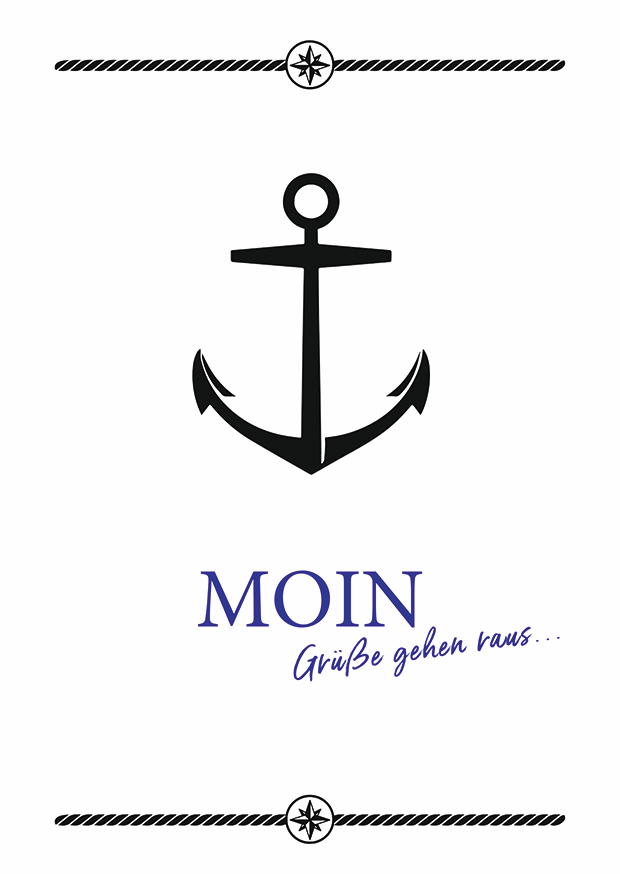 Ein stilisierter schwarzer Anker mit dem Text Moin und Grüßen auf hellen Hintergrund, perfekt für Nordsee-Liebhaber und maritime Anlässe.