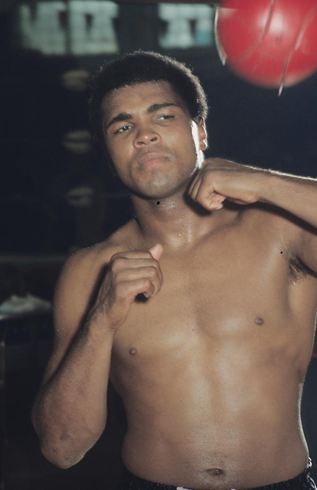 Muhammad Ali zeigt seine beeindruckenden Boxfähigkeiten, während er in einem Trainingsraum an einem Boxsack arbeitet und seine Beweglichkeit unter Beweis stellt.