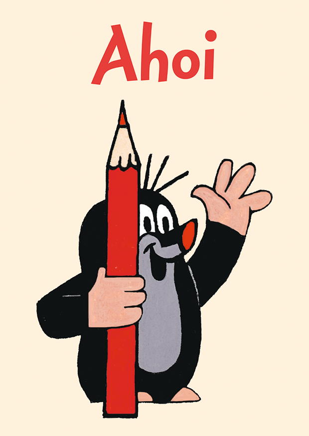 Ein fröhlicher Maulwurf hält einen großen roten Bleistift in seiner Hand und winkt mit der anderen Hand. Die Szene strahlt Kreativität und Freundschaft aus.