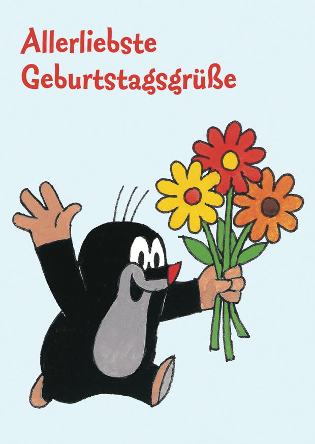 Ein niedlicher Maulwurf steht lächelnd mit einem bunten Strauß aus gelben und roten Blumen. Er sendet fröhliche und herzliche Geburtstagswünsche.