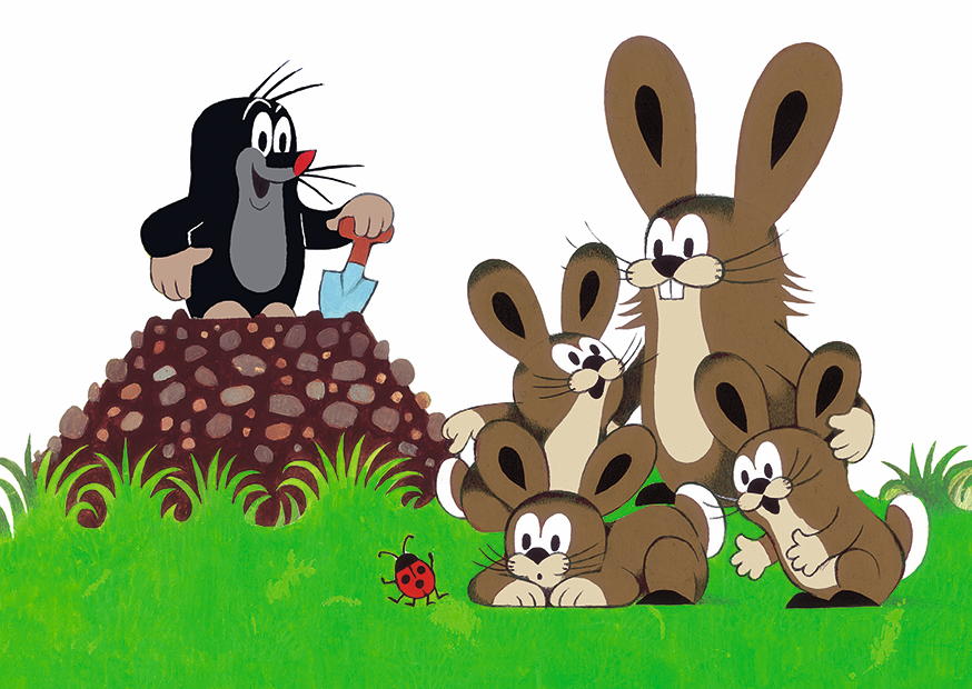 Der Maulwurf gräbt neugierig in den Boden, während ihn vier flauschige Hasen umgeben. Gemeinsam genießen sie den sonnigen Frühlingsnachmittag auf der grünen Wiese.