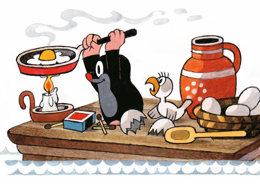 Der Maulwurf steht auf einem Tisch am Wasser, während er ein Spiegelei in einer Pfanne brät. Sein Freund, ein Vogel, beobachtet ihn gespannt. Das Sonnenlicht spiegelt sich auf dem Wasser.