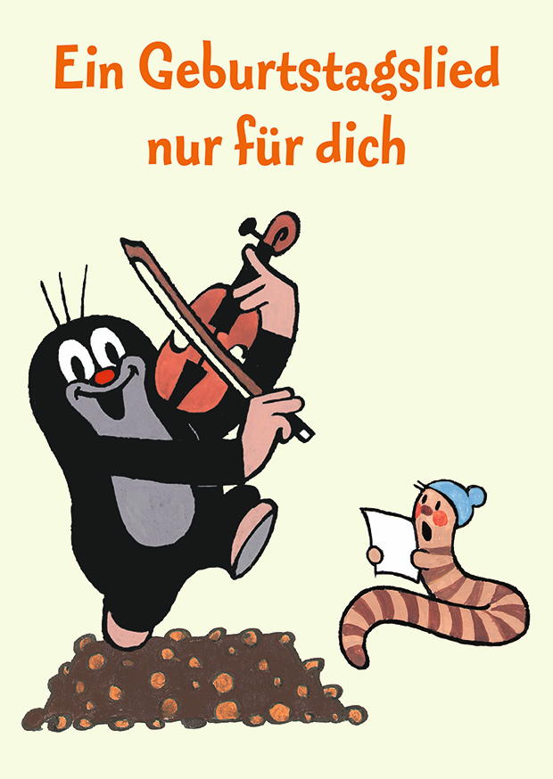 Ein Maulwurf spielt fröhlich Violine, während ein Regenwurm ein Geburtstagslied für ihn lauscht. Beide genießen den besonderen Moment in der Natur.
