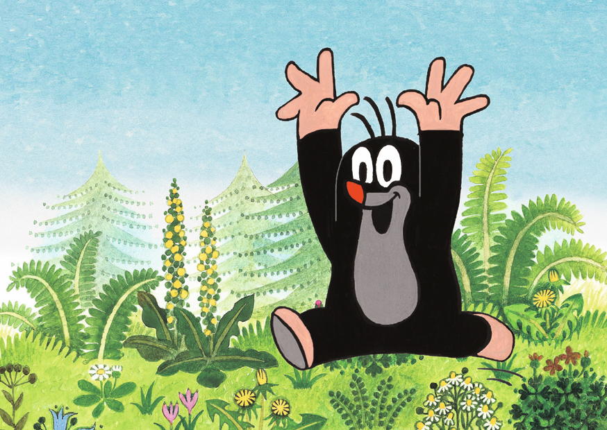 Der kleine Maulwurf sitzt fröhlich in einem blühenden Garten, umgeben von bunten Blumen und grünen Pflanzen. Er hebt die Arme vor Freude und genießt die Natur.